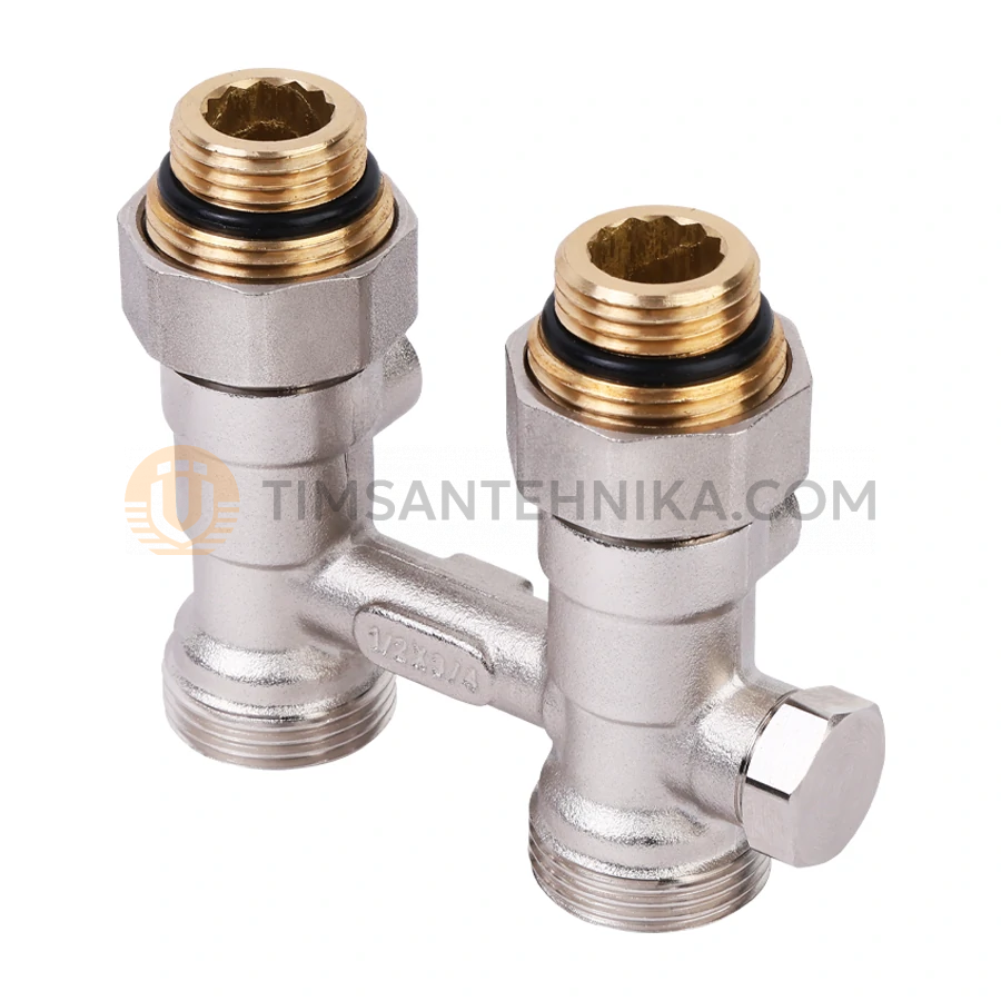 Узел угловой перекрёстный НВ радиаторный со встроенными запорными вентилями и ниппелями 1/2"×3/4" ЕК, RBX601.03
